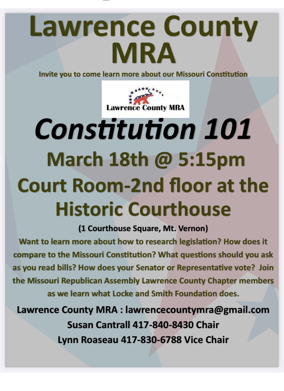 Lawrence County MRA invite you to come learn more about our Missouri Constitution. Want to learn more about how to research legislation? How does it compare to the Missouri Constitution? […]